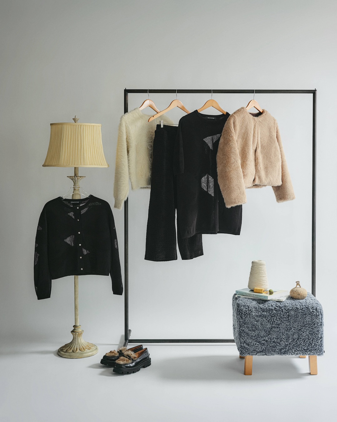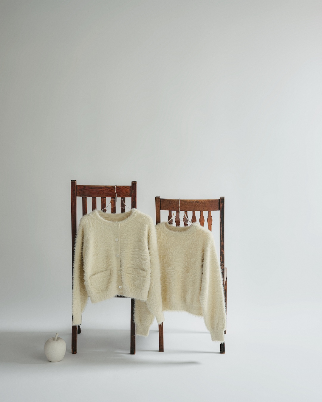 毛足の長いシャギー糸を使用した、あたたかみのある表情が魅力のシャギーニットシリーズ。