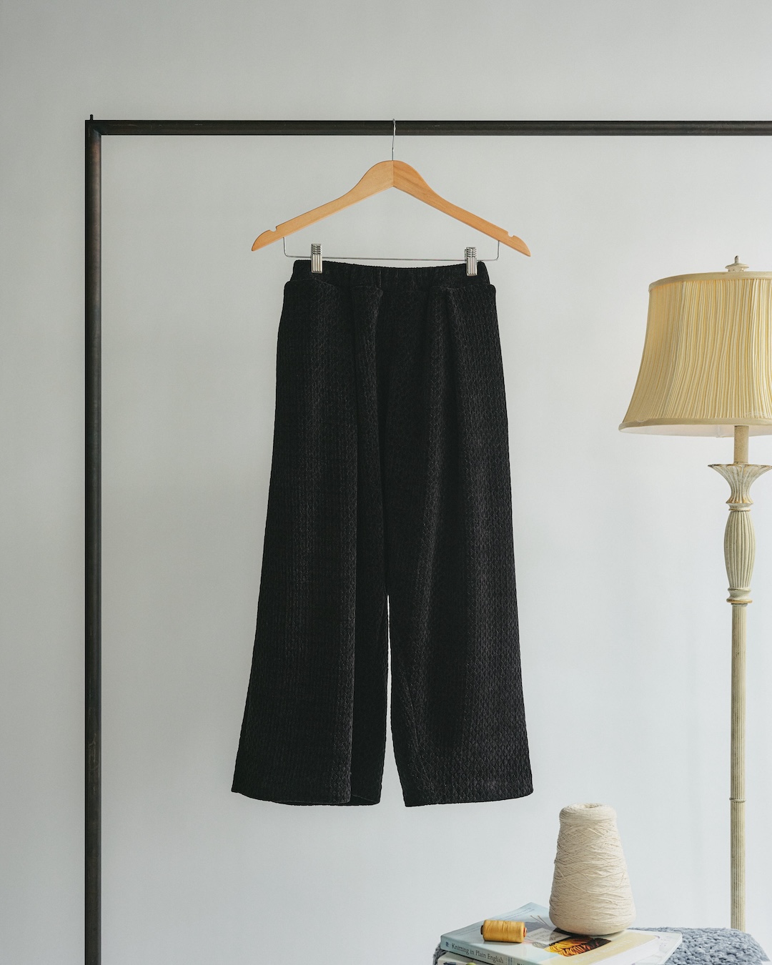 上品な光沢感が魅力のベロア素材を使用した、タック入りのワイドパンツ。編み柄のように表現されたダイア柄とアラン柄がアクセントとなり、ニットのようなあたたかみと、モードな印象を兼ね備えています。