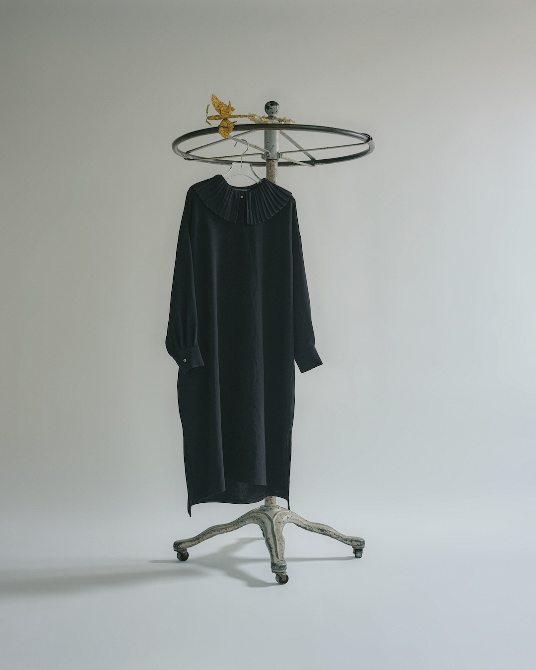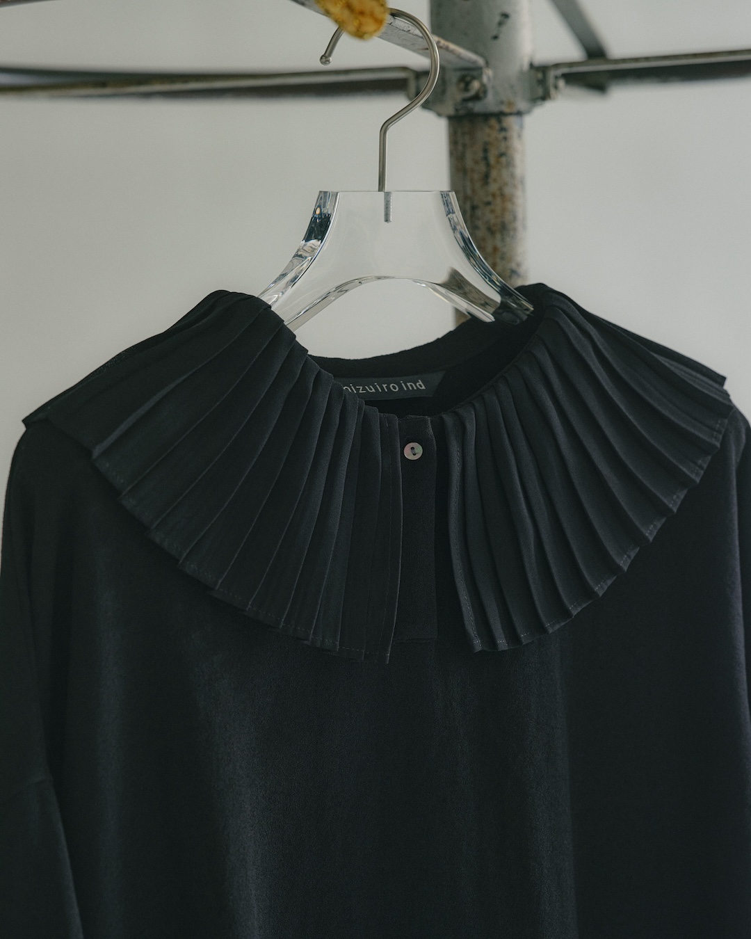 首元を一周する丸みのある大きなプリーツカラーがチャームポイント。クラシカルなムードを漂わせながらも、顔まわりを華やかに演出してくれます。フロントは比翼仕立てで、すっきりとした印象に。スムーズな着脱ができるのも嬉しいポイントです。