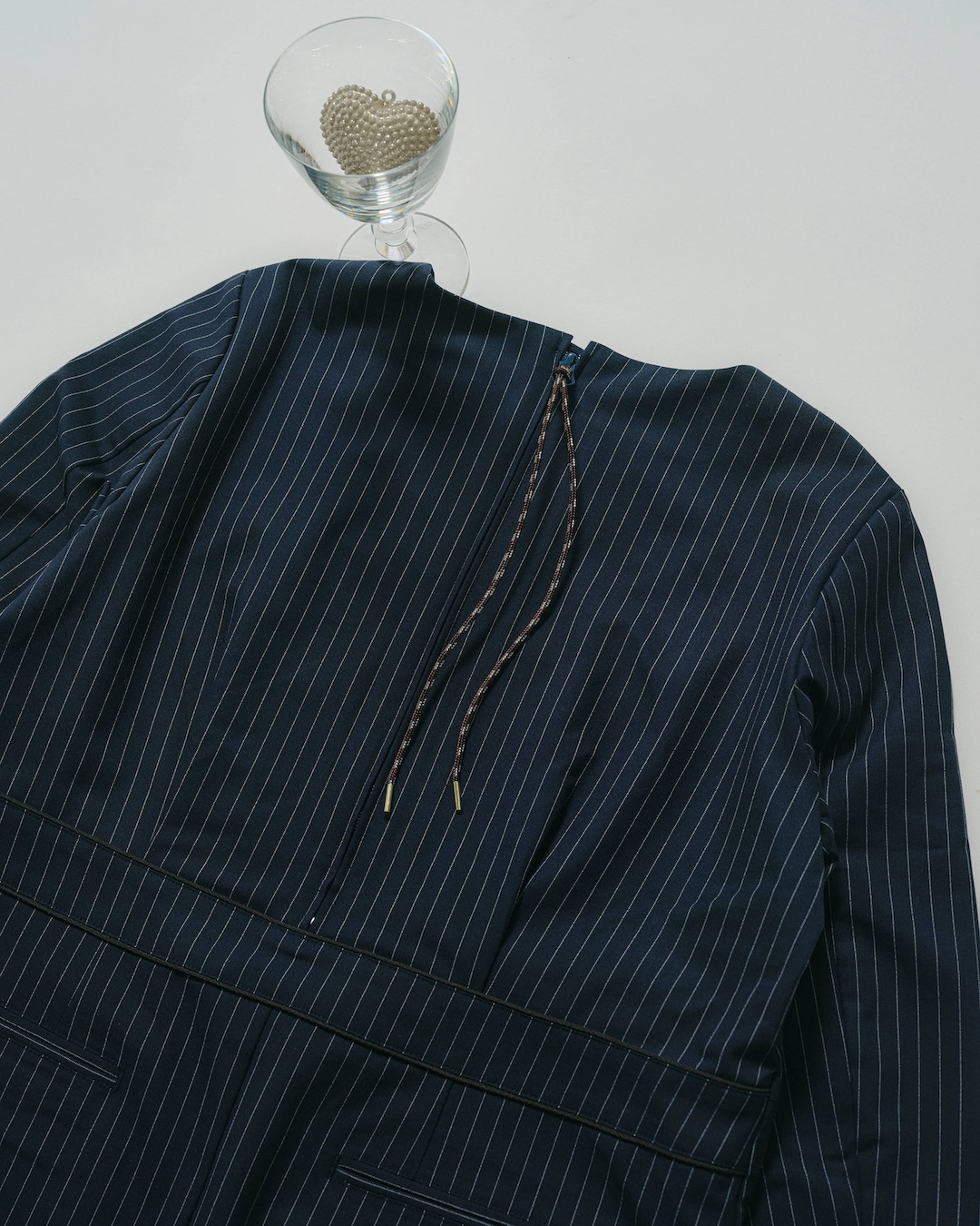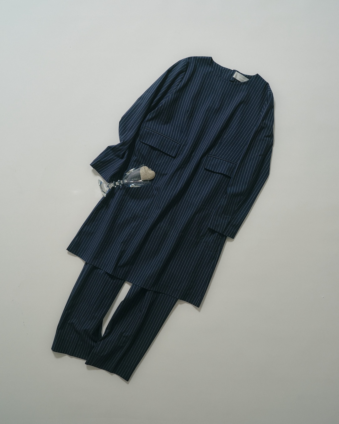 スーツ地のような表情を持つ、程よい肉感のツイル素材を使用したミニマルなドレス&スラックスのセットアップ。 メンズのジャケットやスラックスのディテールを活かした、端正な仕立てと遊び心のあるストライプ柄が魅力です。