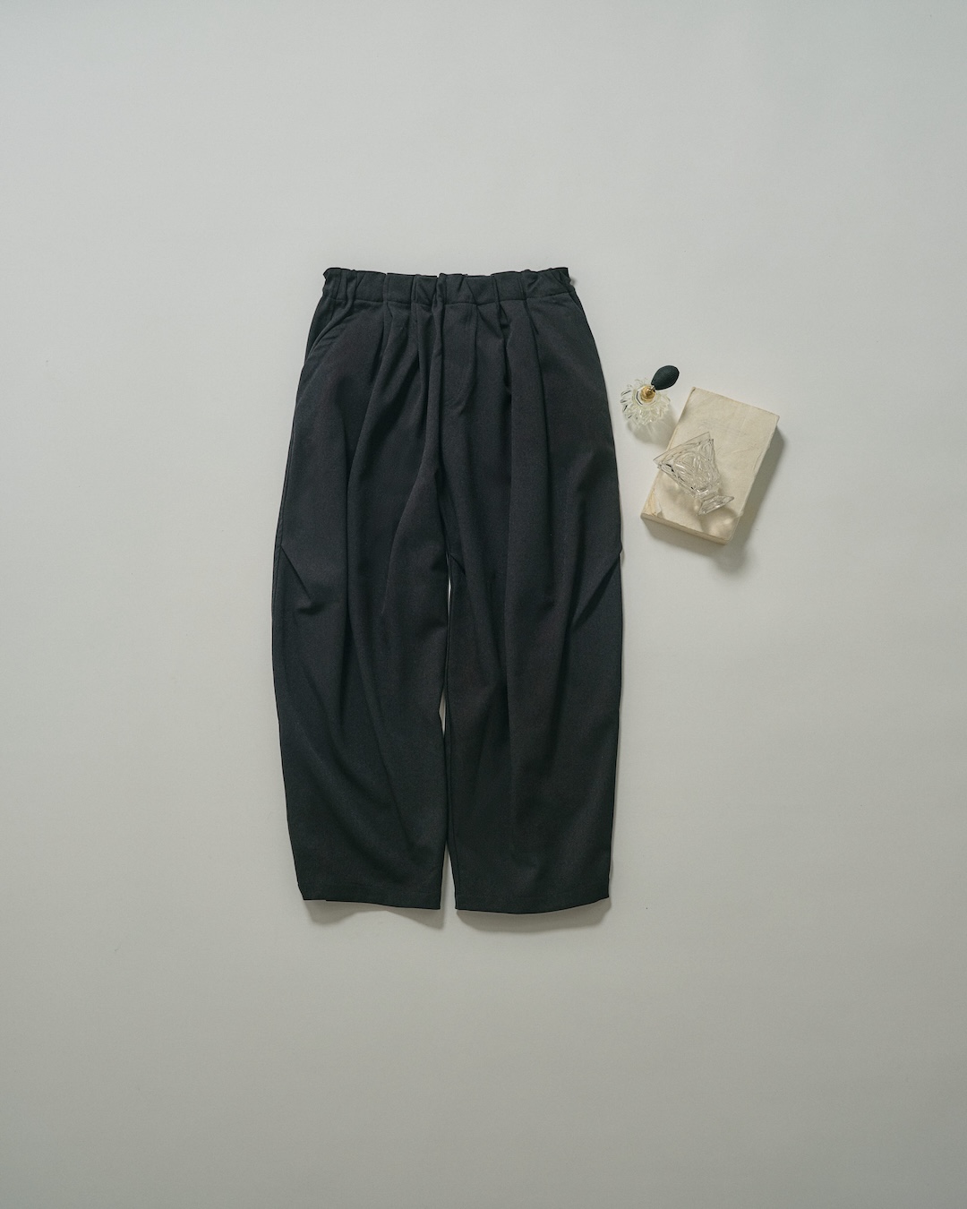 膝に施したタックが生み出す立体感と、ゆったりとしたボリュームのあるワイドシルエットが特徴。ウエストは中紐付きのゴム仕様で、ストレスなく着用できる嬉しい設計に。