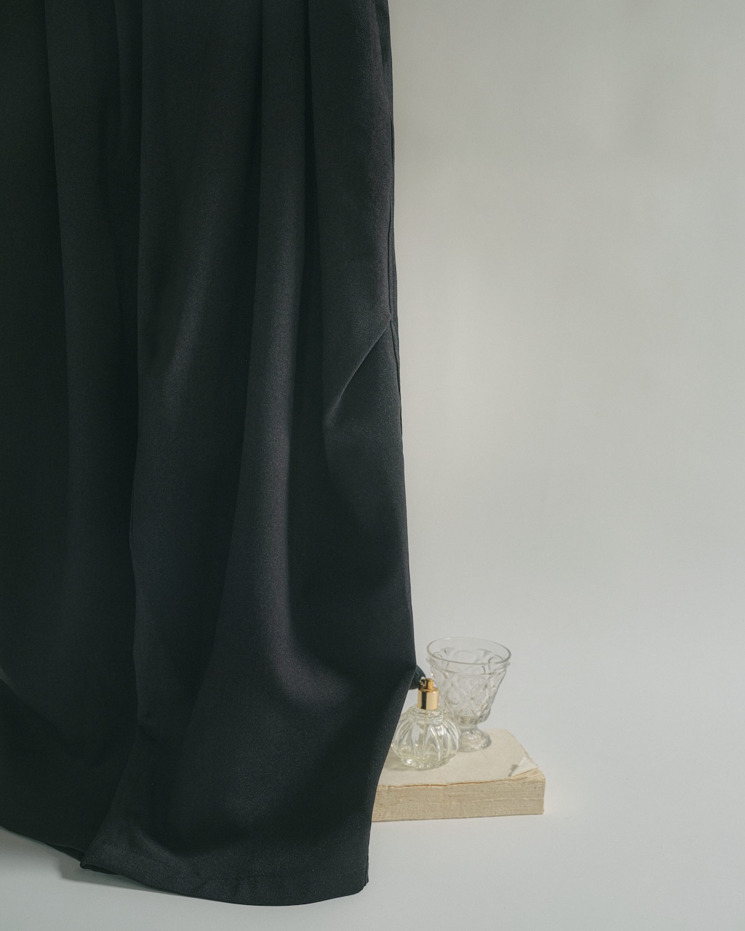 ドレスの背中のファスナーにはコードアクセントを、スラックスのウエスト部分にはコードを配するなど、シンプルな中にもさりげない個性をプラス。クラシカルな印象を保ちながら、どこかモードな雰囲気も漂う一着です。